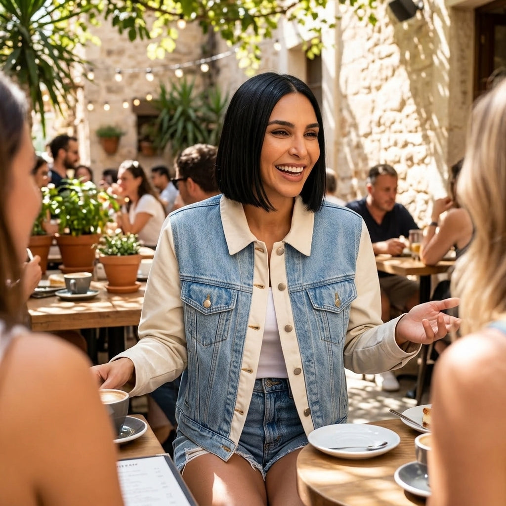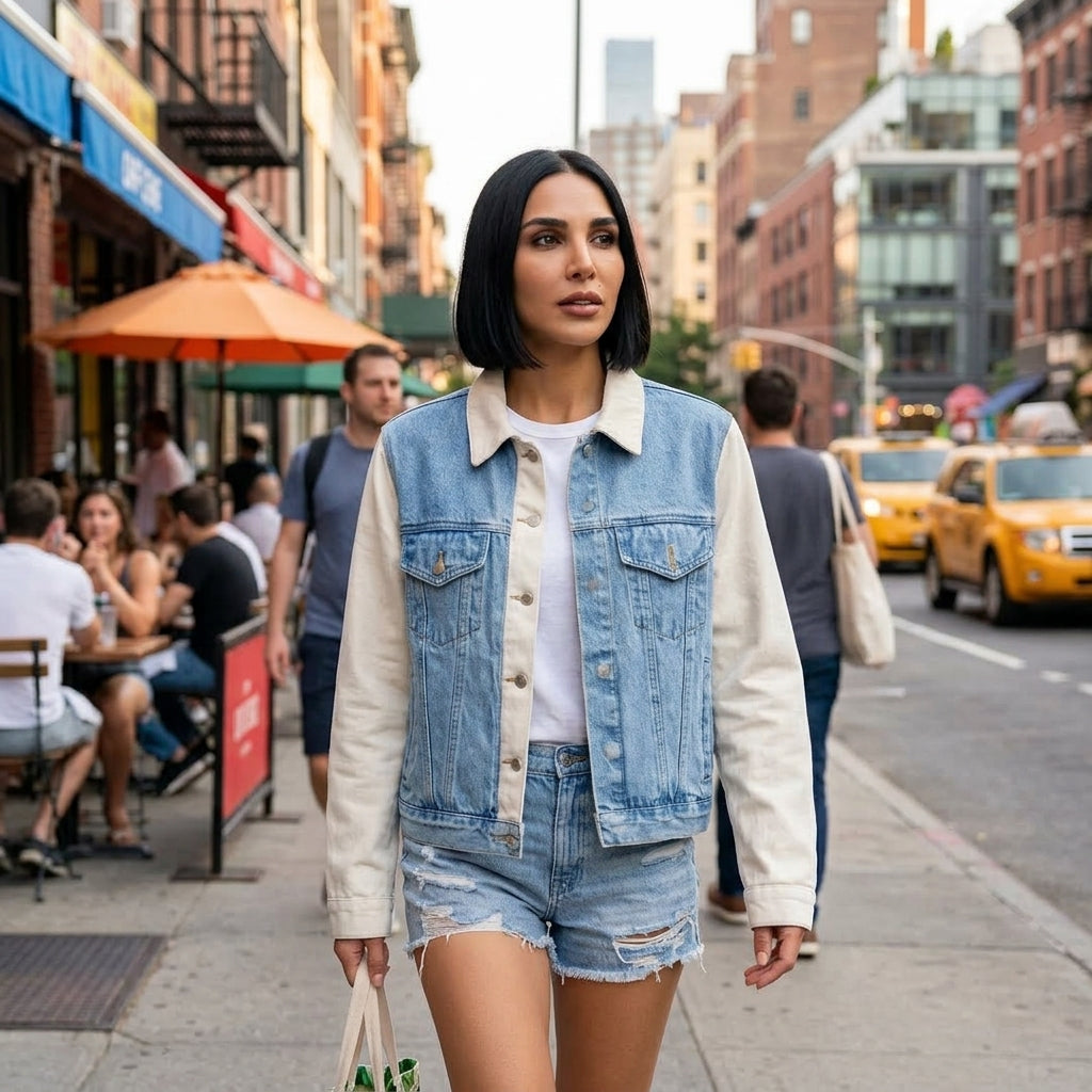 • Experience the striking contrast of premium blue denim paired with tailored cream-colored sleeves for a clean, sophisticated aesthetic.