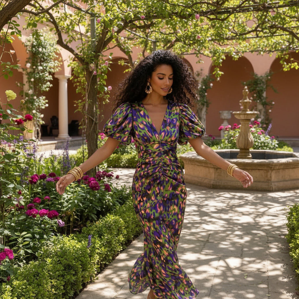 Bold, beautiful, and designed for standout occasions, the Bella Women's Midi Dress is your go-to choice for making a statement. With its eye-catching puff sleeves and flattering ruched waist, this dress is perfect for weddings, garden parties, or any summer event. The vibrant abstract print adds a touch of fun, while the elegant satin fabric ensures a soft sheen finish that elevates your look effortlessly.