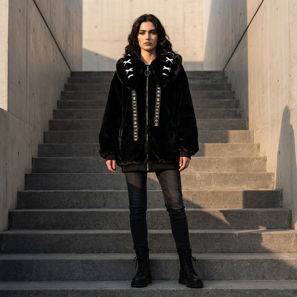 Blur the line between cozy and statement-making with the Neko Women's Faux Fur Hoodie Jacket. Available in crisp white and deep black, this oversized zip-up is crafted from plush, cloud-soft faux fur that wraps you in warmth from the first wear. The standout sculpted bunny ears rise from the hood, each detailed with bold cross-stitch embroidery for an edgy-cute contrast. Flat branded drawstring tapes hang from a silver ring zipper pull at center front, adding a sleek, street-ready finish to an otherwise whimsical silhouette. Ribbed cuffs keep the fit snug at the wrists while the relaxed, oversized body moves effortlessly with you — equal parts cozy companion and conversation starter.